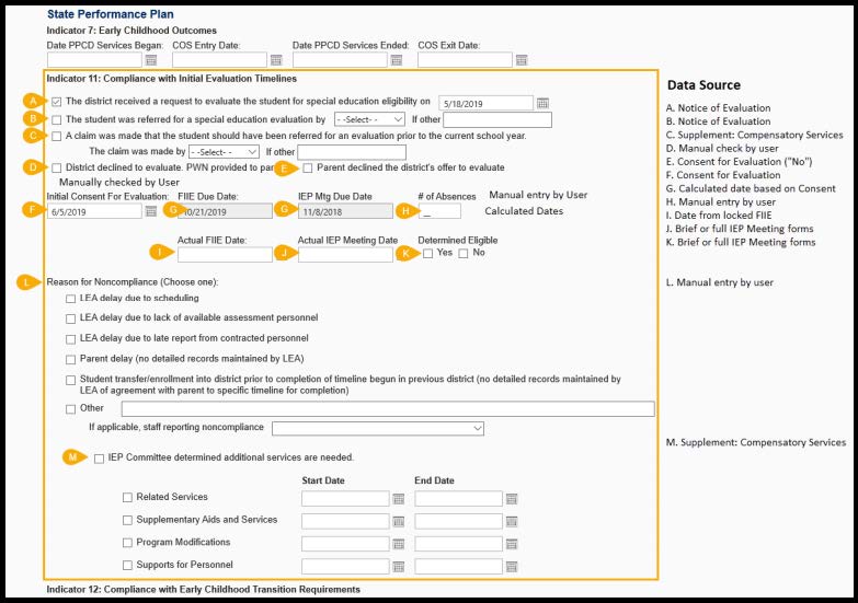 Districts may choose to use the forms in SE Manager and SE FIE to trigger SPP Indicator 11, or data may be manually entered on Program Compliance.