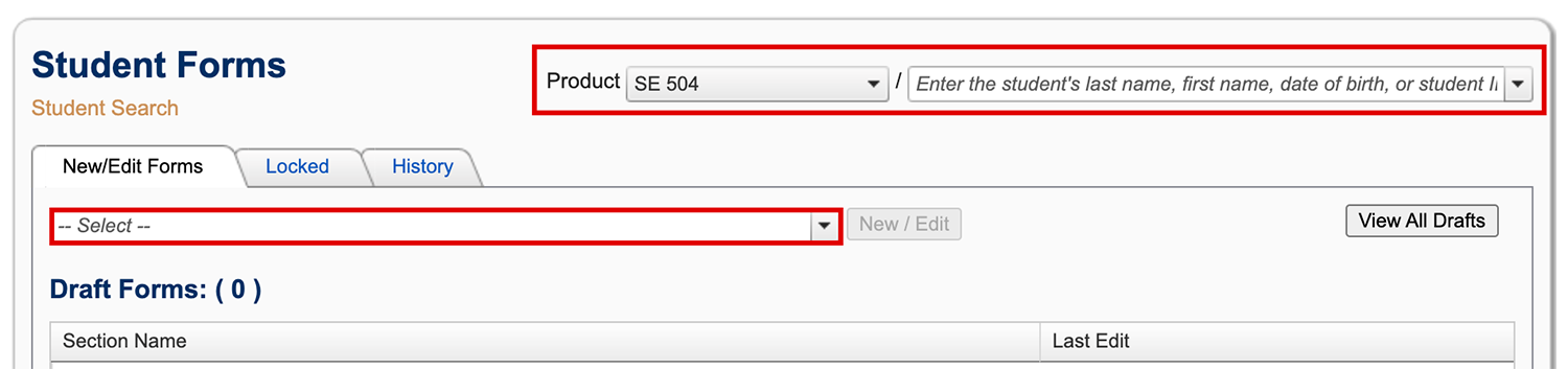 Go to SE 504 and enter in a few characters of the students name in the "Enter Students Last Name..." dropdown to locate the student in question. You can then add the Section 504 Evaluation form from the "New/Edit Forms" dropdown.