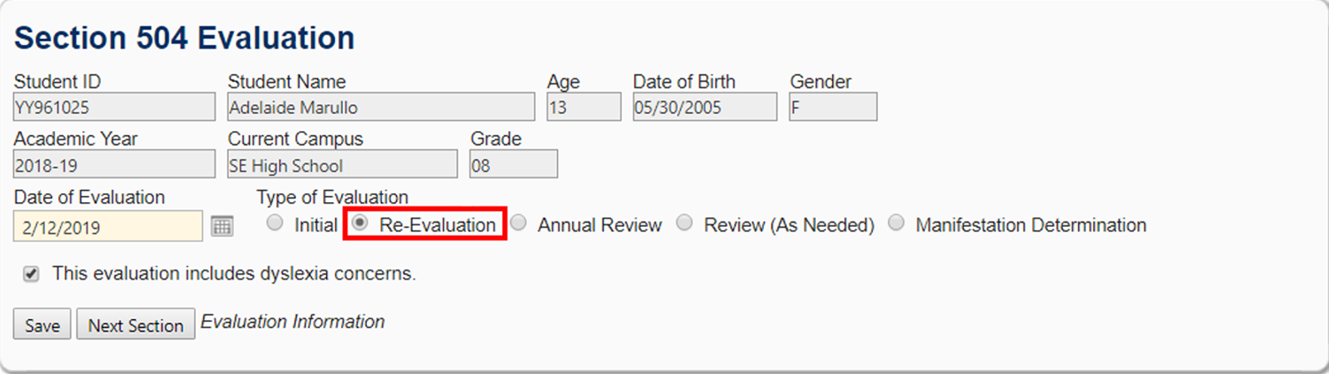 This selection will allow you to mark the evaluation as Re-Evaluation under the Type of Evaluation.