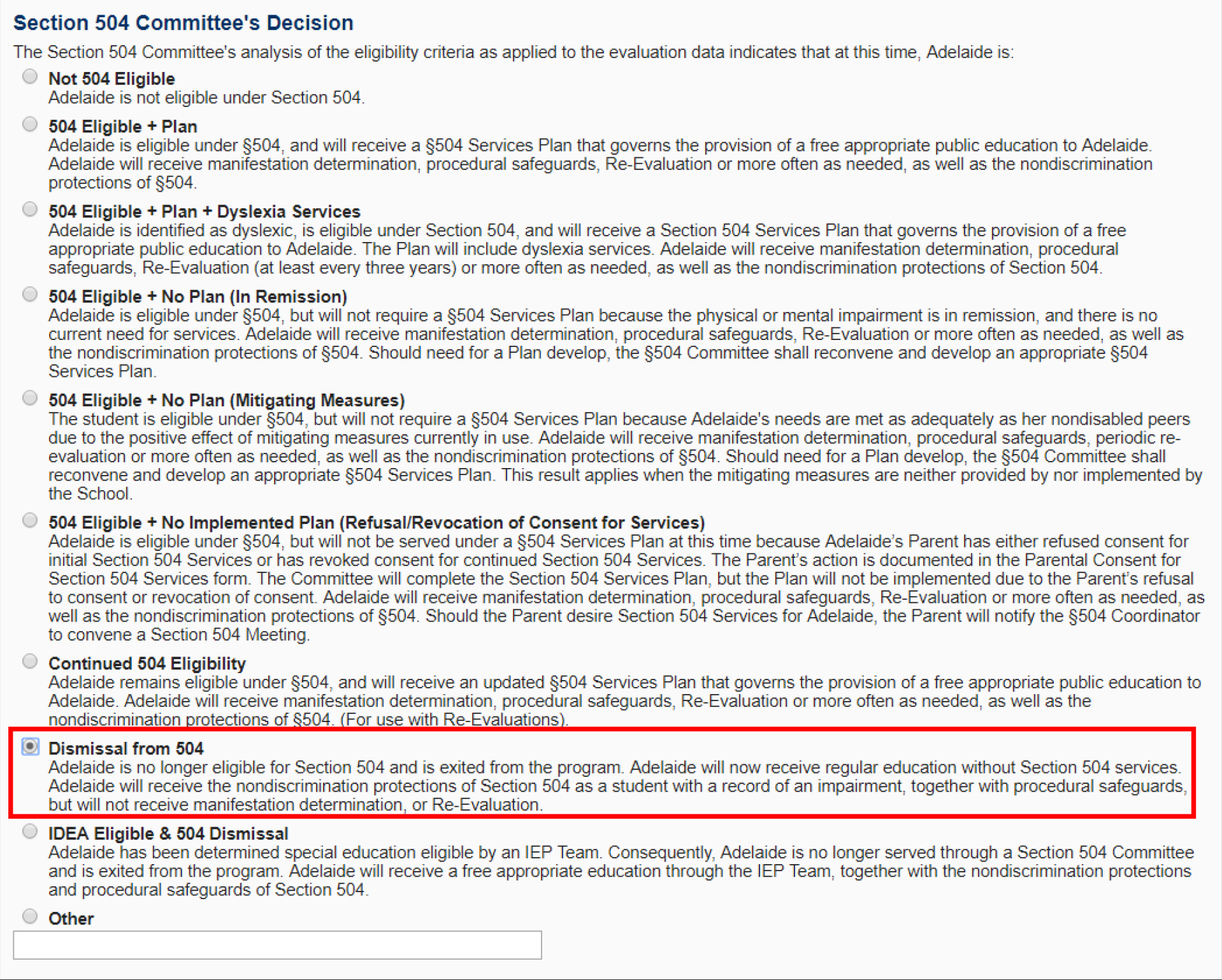 If your student is being dismissed from Section 504, the steps below will walk you through the proper way to address it in your Section 504 Evaluation form.