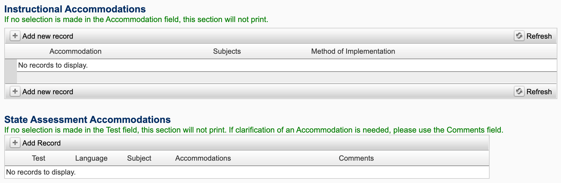 - You can leave the "Instructional" and/or "State Testing Accommodations" boxes empty if the student does not require those accommodations.